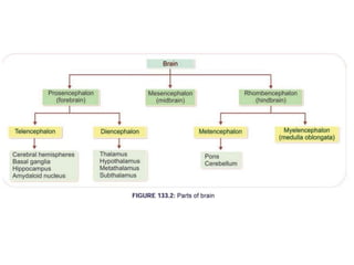 The document summarizes the human nervous system. It is divided into the central nervous system (CNS) and peripheral nervous system. The CNS contains the brain and spinal cord. The brain is divided into the forebrain, midbrain, and hindbrain. The spinal cord extends from the brain and transmits signals between the brain and body. The peripheral nervous system includes the somatic and autonomic nervous systems. The somatic system connects to skeletal muscles while the autonomic system regulates involuntary functions.