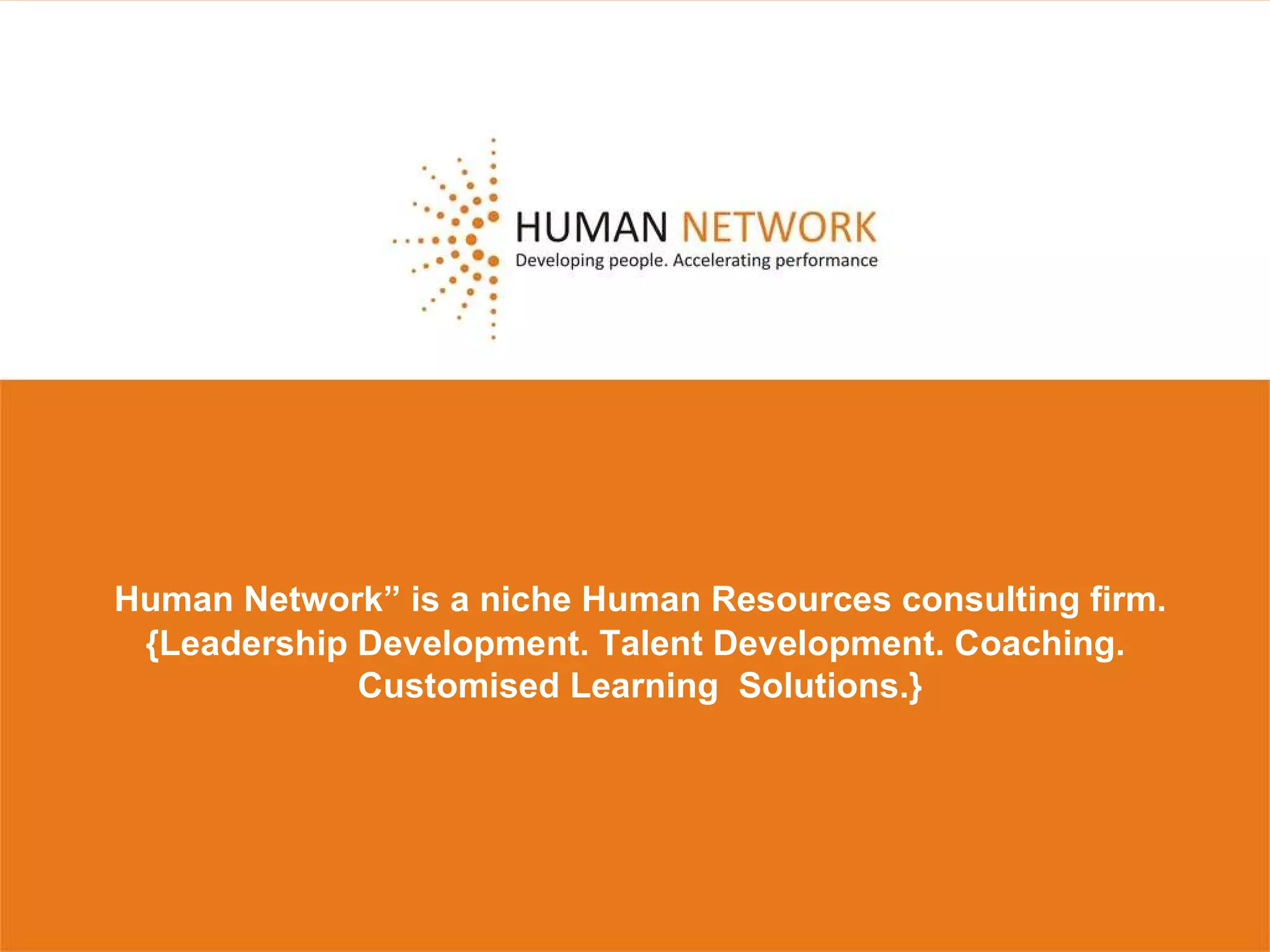Human Network is a niche HR consulting firm focused on leadership and talent development, coaching, and customized learning solutions. Founded by Ashwin Pasricha, the firm employs a five-step methodology to engage clients and address their specific business challenges through tailored interventions. Their programs aim to enhance individual and organizational performance by building a strong leadership pipeline and fostering a coaching culture.