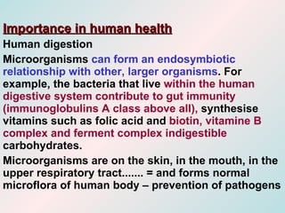 The document discusses the microflora of the human body, including bacteria that form symbiotic relationships in the digestive system. It notes that microorganisms are present on the skin, in the mouth, respiratory tract and form the normal microflora that prevents pathogenic bacteria. The human flora includes bacteria, fungi and archaea that inhabit the body, some of which are useful while most have no known effect. The composition of the normal flora depends on factors like genetics, age and nutrition.