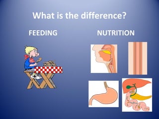 This document discusses human nutrition and the systems involved. It defines nutrition as the processes by which the body obtains nutrients from food and transports them through the body. The digestive, respiratory, circulatory, and excretory systems are involved in nutrition. Nutrients include organic substances like carbohydrates, lipids, proteins, and vitamins, as well as inorganic minerals and water. A balanced diet provides energy and regulates the body's functions. Special diets and food preservation methods help ensure proper nutrition.