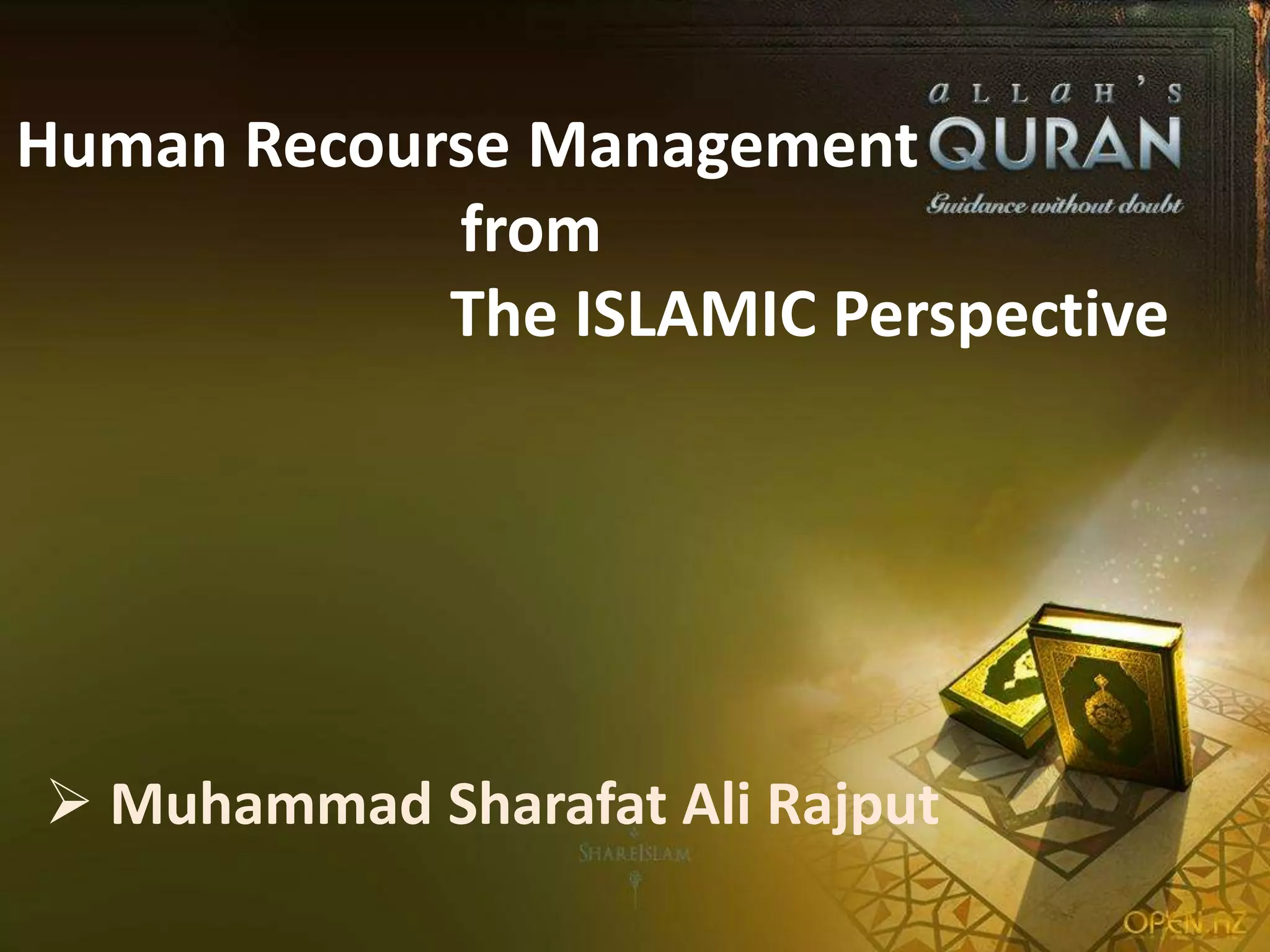 This document summarizes the Islamic perspective on human resource management. It discusses the main functions of HRM including staffing, training, motivation, and maintenance. It provides Quranic verses and sayings of Prophet Muhammad to support an Islamic approach to each function. For staffing, it notes the importance of choosing candidates based on their capabilities rather than favoritism. For training, it emphasizes acquiring knowledge. For motivation, it discusses rewarding good behavior. For maintenance, it discusses punishing wrongful behavior. The overall message is that Islamic principles should guide all aspects of human resource management.
