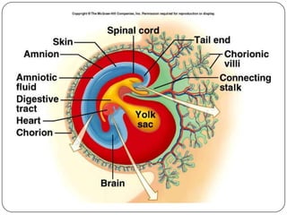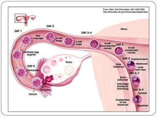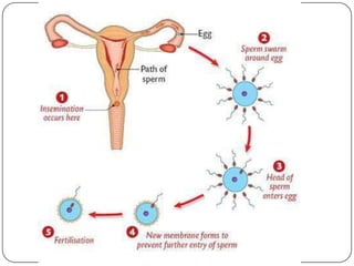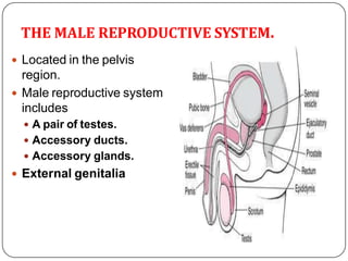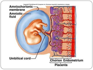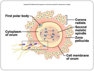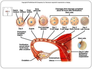 The document outlines the anatomy and functions of the male and female reproductive systems, detailing structures such as testes, ovaries, and various ducts and glands involved in gametogenesis. It describes the processes of spermatogenesis and oogenesis, the menstrual cycle phases, fertilization, and early embryonic development, including the role of the placenta. Additionally, it addresses sex determination and the stages of pregnancy and parturition.