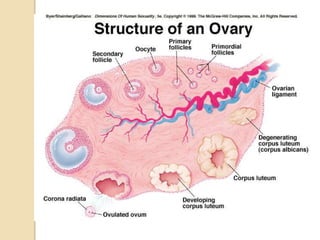3. The female reproductive system is outlined, including the ovaries, oviducts, uterus, cervix, vagina, and external genitalia. Oogenesis and the menstrual cycle are briefly explained.