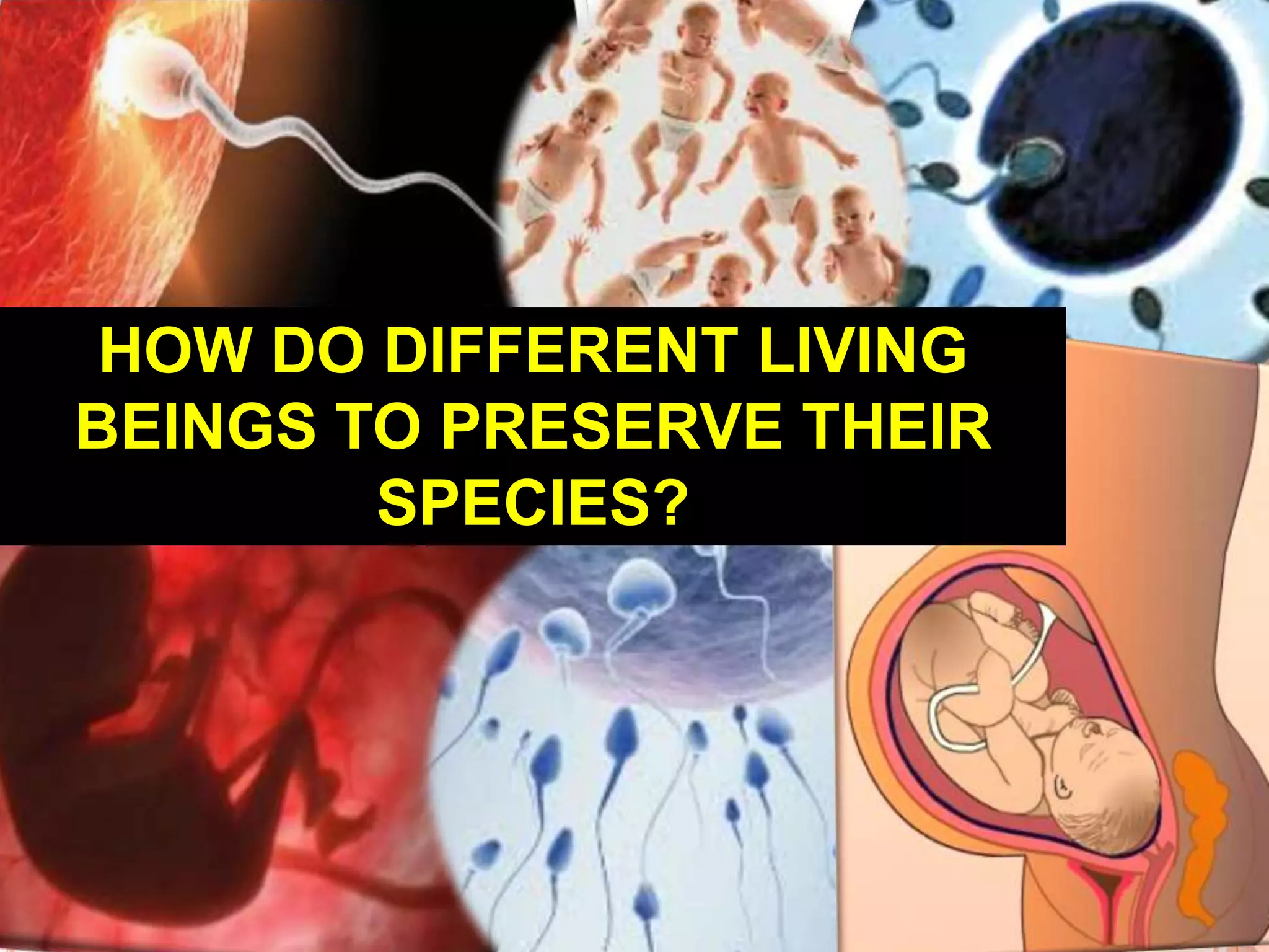 Different living beings preserve their species in different ways. Females have reproductive systems that allow embryos to develop in their wombs until birth. Males have reproductive systems that produce sperm to fertilize eggs. There are also artificial ways to fertilize eggs, such as artificial insemination which places sperm into the female reproductive tract without intercourse, or in vitro fertilization where eggs are fertilized by sperm outside the body in a laboratory setting before being placed in the uterus.
