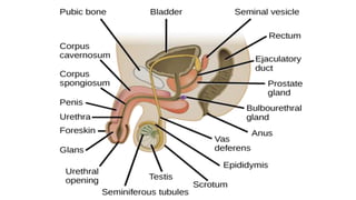 The reproductive systems in males and females consist of both primary and secondary sex organs and glands. The primary function is reproduction through fertilization. The male reproductive system includes external organs like the penis and scrotum, and internal organs like the testes, vas deference, and prostate. Sperm are produced in the testes and travel through the vas deference. The female reproductive system includes external organs like the vulva and internal organs like the ovaries, uterus, cervix, and fallopian tubes. The ovaries produce eggs and the uterus provides nourishment to an embryo during pregnancy. The menstrual cycle regulates female fertility through phases like the follicular, ovulatory, and luteal phases.