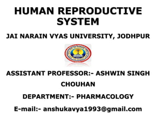 The document provides information about the human reproductive system. It discusses that reproduction allows organisms to produce offspring similar to themselves. The male and female reproductive systems both contribute gametes - sperm and eggs respectively - which can unite during fertilization. The male system produces sperm in the testes and transports it, while the female system produces eggs and supports gestation and birth. The parts of each system are described in detail, including their functions in fertilization and development.