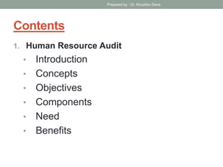 This document provides an overview of human resource audits. It discusses the introduction, concepts, objectives, components, need, benefits, and approaches of human resource audits. The key points covered are: