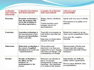 This document discusses frameworks for human resource development (HRD) processes. It describes a common framework involving four phases: needs assessment, design, implementation, and evaluation ("A DImE"). It provides details on each phase, including defining need, types of needs assessments, levels of need assessment, designing objectives and selecting delivery methods, and evaluating training impact and costs. Kirkpatrick's four levels of evaluation (reaction, learning, behavior, results) are also discussed. The document presents models and best practices for conducting effective HRD from needs identification through evaluation.
