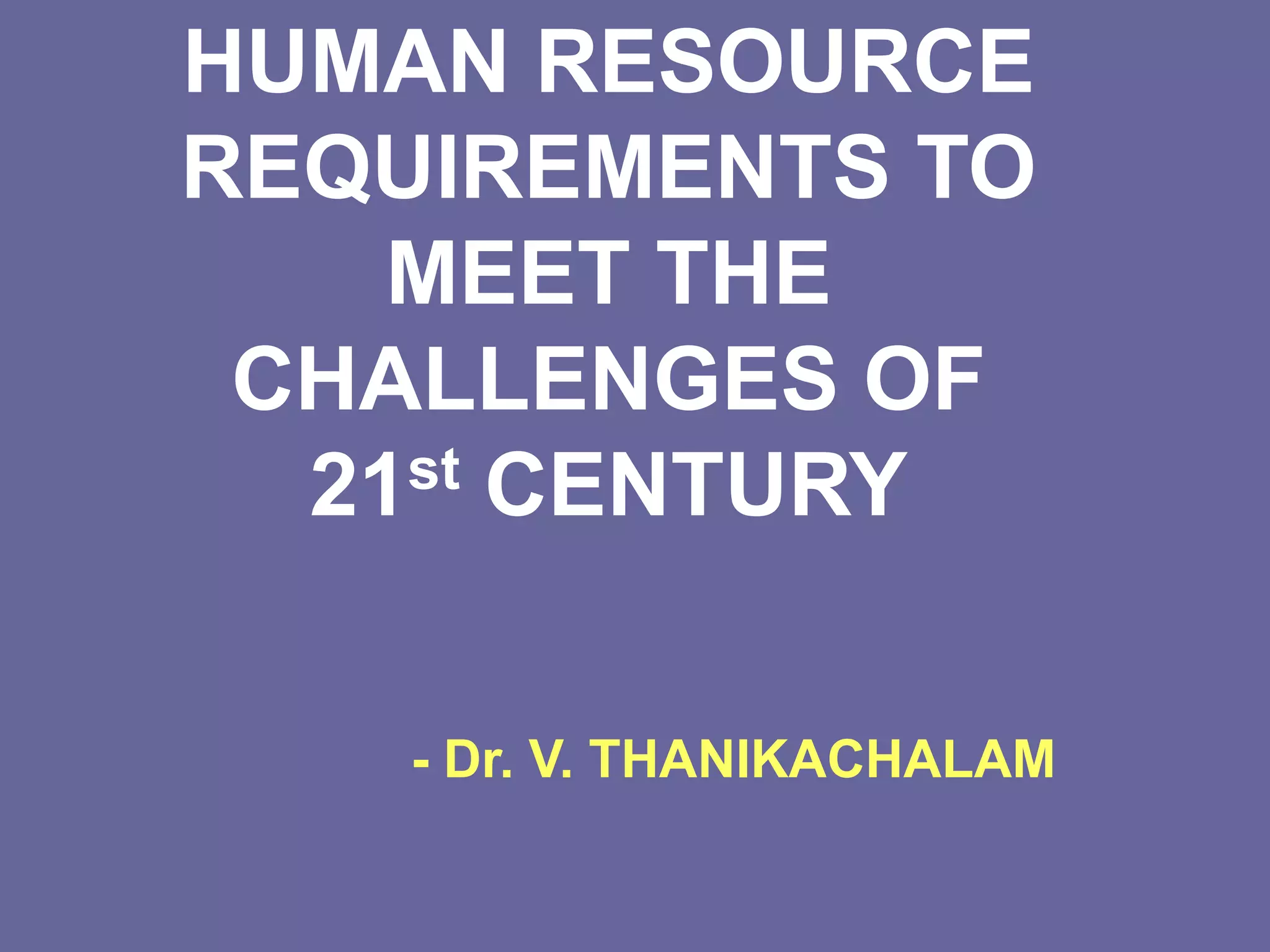 The document discusses the human resource requirements for meeting 21st-century challenges in engineering and technology in India, emphasizing the importance of human capital development for industrial advancement. It highlights issues such as the shortage of skilled workers and the need for improved technical education to enhance global competitiveness, particularly with respect to emerging opportunities and challenges from globalization. The text outlines the urgent need for strategic collaborations between educational institutions and industries to address skills gaps and foster innovation to support India's growing economy.