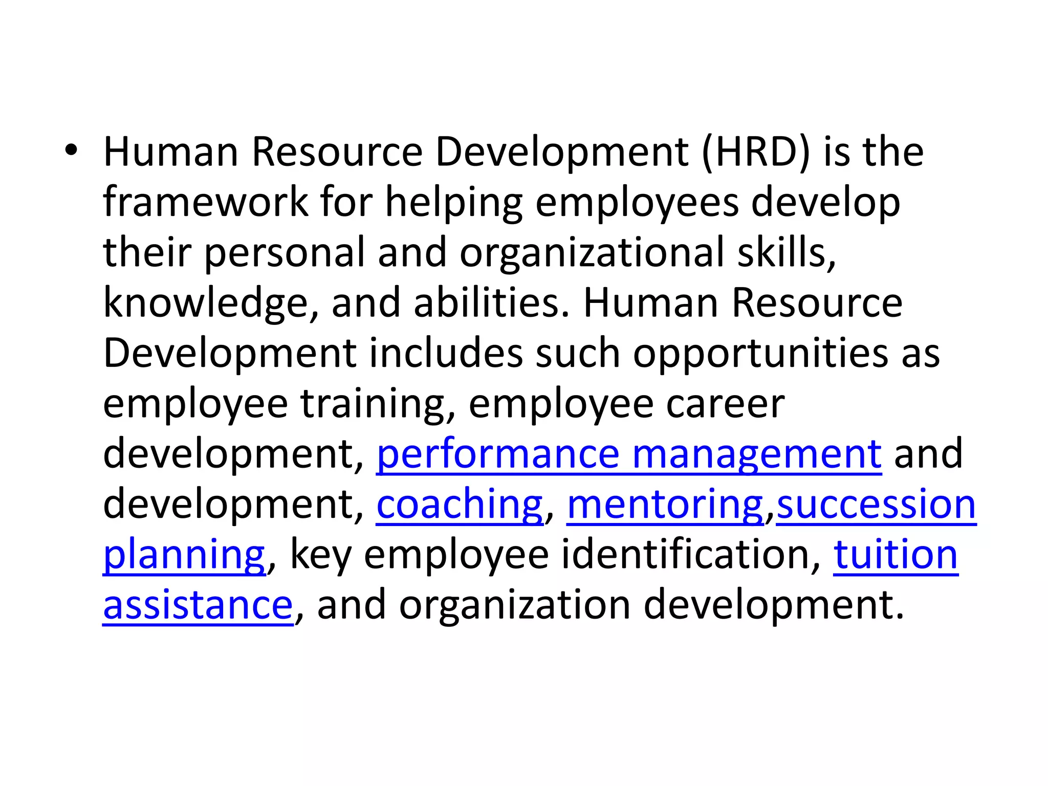 Human Resource Development (HRD) and Human Resource Management (HRM) both focus on developing employees but with different aims. HRD aims to develop employees' full potential and improve organizational performance through opportunities like training and mentoring. HRM aims to improve productivity and focuses on issues like compensation and hiring. Both are influenced by factors like business strategies, legislation, and social change. While HRM views employees as costs, HRD believes all employees have potential that can be developed to benefit both the employee and organization.
