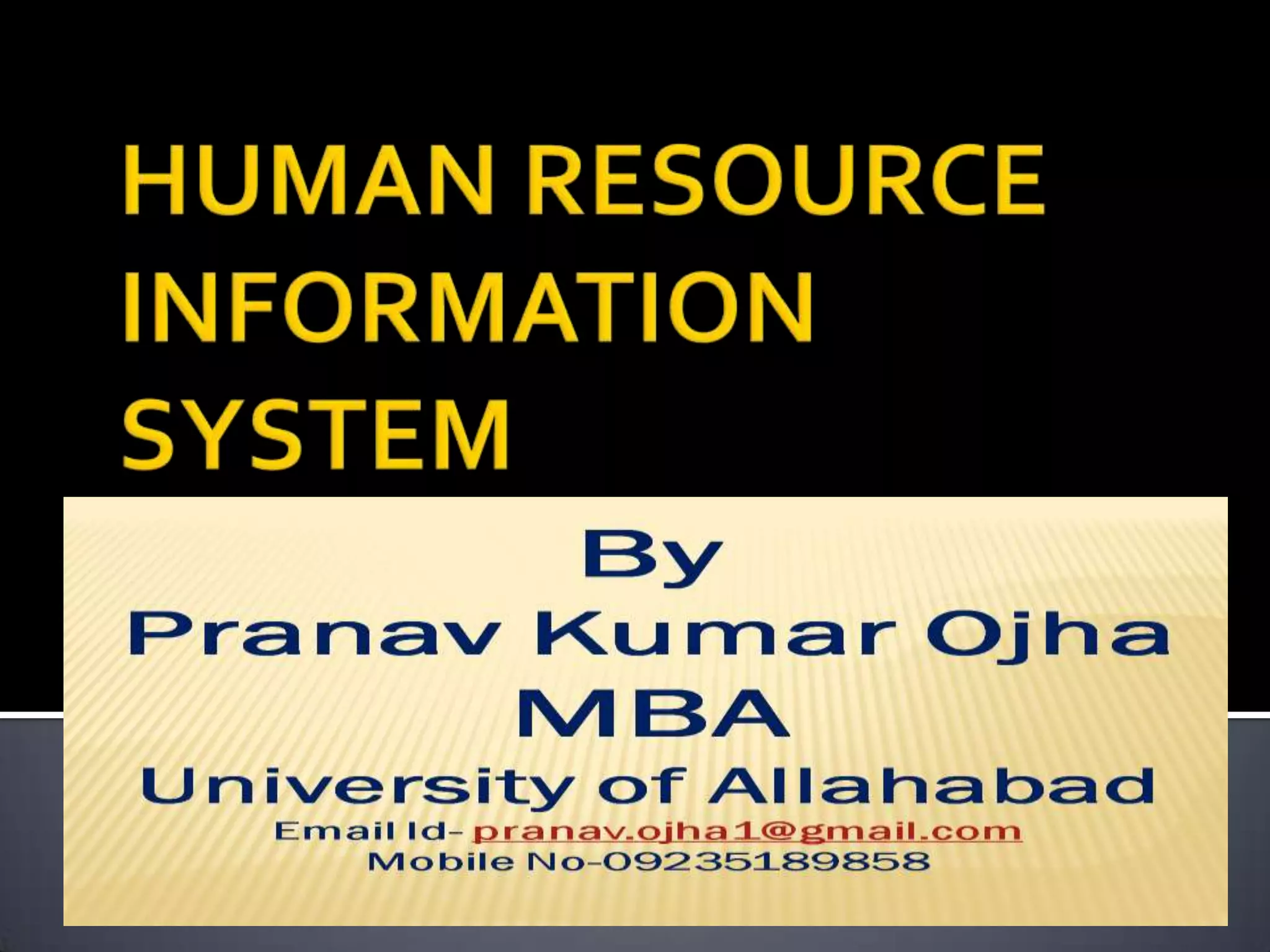 HRIS stands for Human Resource Information System. It is a system used to collect, store, manipulate, analyze, interpret, and disseminate information regarding an organization's human resources. HRIS provides effective planning and policy formulation, monitors performance, and provides inputs for strategic decision making. It automates routine HR processes, reduces costs, and allows for faster responses to employee needs and services.