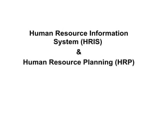 This document discusses Human Resource Information Systems (HRIS) and Human Resource Planning (HRP). It defines HRIS as a database system that stores employee information and feeds into HR decisions. HRP is a systematic process to ensure the right employees are in the right positions at the right time. The document outlines the steps in HRP, including assessing current HR, forecasting future demand and supply of employees, matching demand and supply, and developing action plans to address surpluses or shortages.