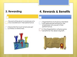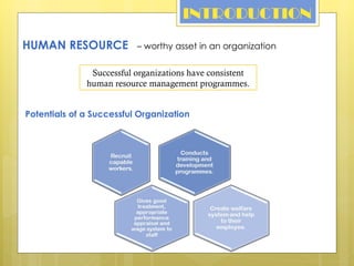This document discusses key aspects of human resource management. It covers intake and recruitment, work analysis, training, performance management, rewards, career development, and ensuring employee welfare. Successful organizations have consistent HR programs that analyze jobs, recruit and train employees, evaluate performance, offer appropriate rewards, support career growth, and manage stress and provide facilities to improve quality of work life. The document emphasizes that humans are the most important asset in an organization and its success depends on effective human resource management.