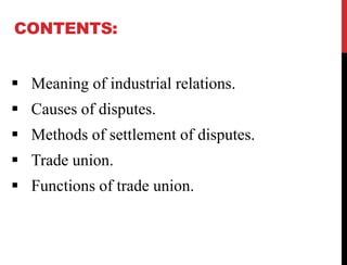 This document discusses human resource management and industrial relations. It defines industrial relations as the relationship between management and workers. It discusses the main causes of industrial disputes such as wage demands, retrenchment, union rivalry, and unfair labor practices. It then outlines several methods for settling disputes, including collective bargaining, grievance procedures, conciliation, arbitration, and adjudication. The document also defines trade unions and their functions in representing workers and negotiating with employers.