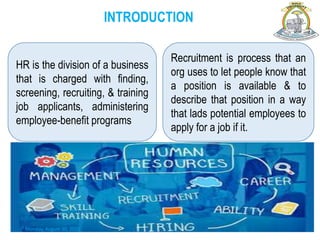 The document discusses human resource management with a focus on recruitment strategies, including e-recruitment, competitive recruiting sources, and creative recruiting methods. It highlights the importance of equity in recruitment practices and the legal considerations relevant during workforce reduction. Additionally, it emphasizes the need for strategic recruitment to effectively attract qualified candidates while adhering to diverse and equitable hiring practices.