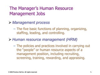 The document outlines learning objectives for a chapter on human resource management. It aims to explain what HR is and its relationship to management processes. It also aims to illustrate how line and staff managers can utilize HR concepts and give examples of HR's role in business strategy and why metrics are important for HR managers. Finally, it outlines the structure of the book.