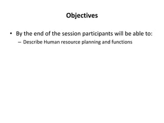This document provides an overview of human resource management functions including: HR planning, recruitment and selection, induction, training and development, motivation, health and safety, performance appraisal, discipline, employment legislation, and remuneration. It describes the purpose of HR planning to meet organizational goals through forecasting workforce needs. Key HR functions like recruitment, selection, training and performance appraisal are summarized. Factors influencing motivation and components of an effective remuneration system are also highlighted at a high level.