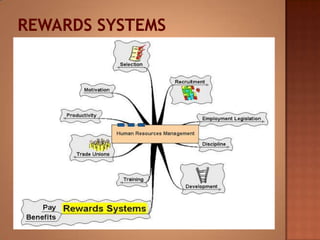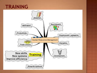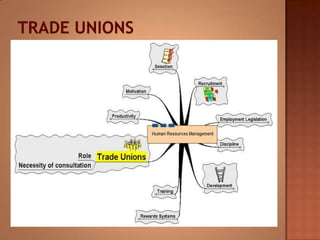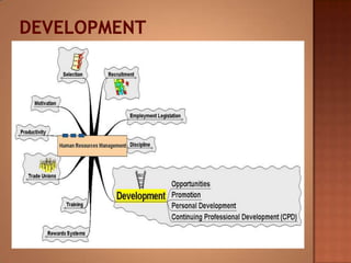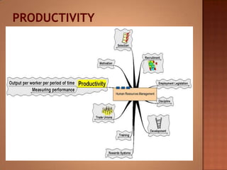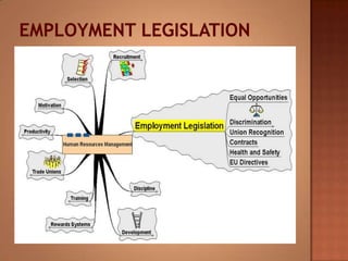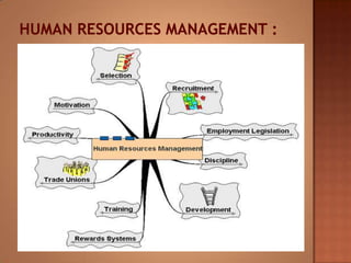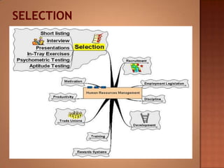This document discusses human resource management. It covers recruitment, selection, employment legislation, development, trade unions, and productivity. Recruitment involves identifying job vacancies and notifying potential employees. Selection assesses candidates and appoints a post holder, often through interviews, testing, and exercises. Employment legislation regulates areas like race, gender, and disability to protect employees. Development adds to employees' skills through training. Trade unions are important for building relationships and negotiating change. Productivity measures workers' contributions through appraisal and performance reviews. Overall, effective HRM engages employees to build a competitive advantage through strategic leadership and two-way communication.