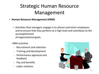Strategic human resource management involves designing HR systems that are consistent with the organization's strategy and goals. It includes recruitment and selection, training, performance evaluation, compensation and benefits, and labor relations. The goal is to attract and retain skilled employees to help the organization succeed. HR planning forecasts needs and availability of human resources. Training and development help employees perform jobs effectively now and in the future. Performance evaluations provide feedback to improve employee performance. Compensation and benefits reward and motivate employees. Labor relations involve negotiating with unions to resolve issues.