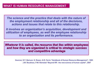 The document discusses human resource management (HRM) as a strategic practice that focuses on the relationship between employees and organizations, emphasizing the importance of human capital in achieving competitive advantage and organizational success. It highlights the evolving nature of talent management in response to changes in workforce demographics, technology, and market dynamics, while also addressing common challenges faced by HR leaders. Furthermore, it outlines key principles for effective HRM, including the necessity for alignment with business strategy and the vital role of line managers in human resources work.