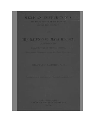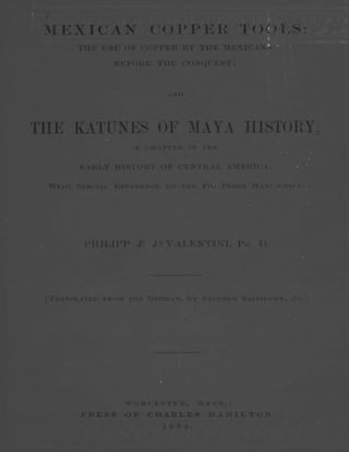 MEXICAN COPPER TOOLS: THEUSE OF COPPER BY THE MEXICANS BEFORE THE CONQUEST; AND THE KATUNES OF MAYA HISTORY, A CHAPTER IN THE EARLY HISTORY OF CENTRAL AMERICA, With Special Reference to the Pio Perez Manuscript. BY PHILIPP J. J. VALENTINI, Ph.D. [Translated from the German, by Stephen Salisbury, Jr.] WORCESTER, MASS.: PRESS OF CHARLES HAMILTON. 1880.