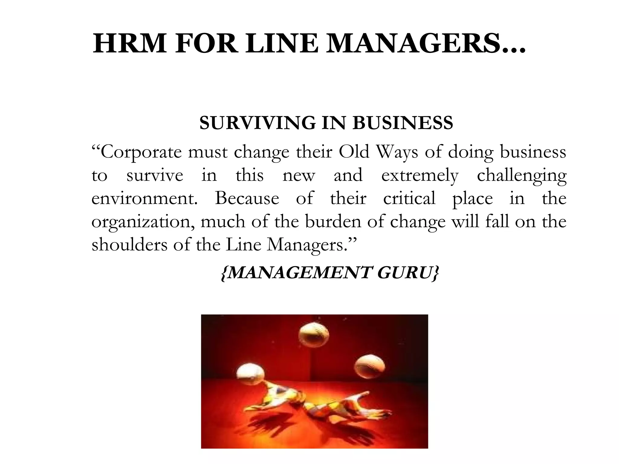 This document discusses the role of human resource management for line managers. It outlines the challenges facing line managers, including rapidly changing business environments and greater workforce diversity. It emphasizes that line managers play a critical role in human resource functions like developing employees, providing feedback, and managing change. The document also discusses the competencies and training needed for line managers to effectively perform human resource responsibilities. It stresses the importance of collaboration between line managers and human resource teams.