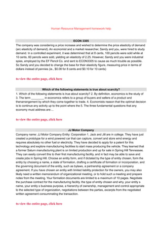 This document provides information about purchasing homework help and exam solutions for a Human Resource Management course from an online company called finishedexams.com. It advertises that the site provides immediate access to full course solutions, exams, and homework without needing to register. It also rates the site highly and says solutions are available without registration. The document then provides an example homework question about calculating price elasticity for pencils and a scenario where the economists providing the analysis were actually industrial spies aiming to cause trouble. It asks which statement about scarcity is true and provides multiple choice answers. Finally, it mentions that clicking on the document would show the entire page of content.