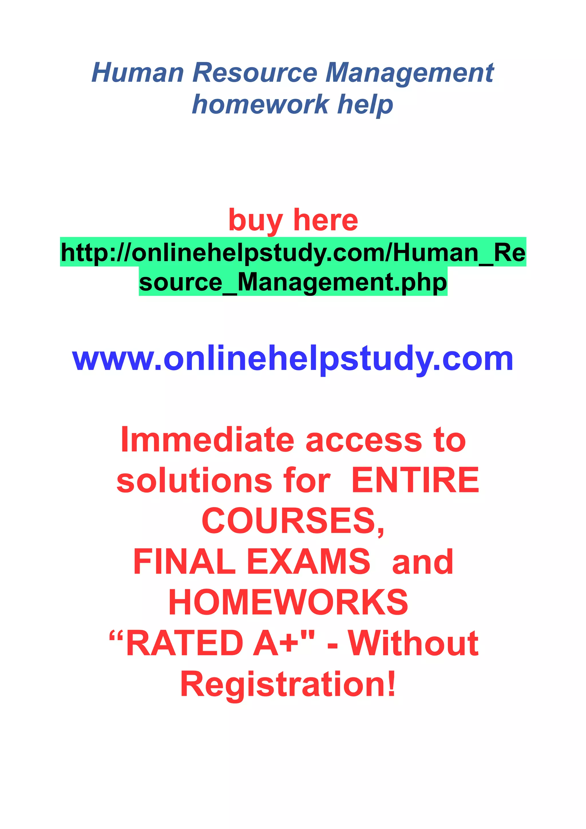The document provides information about online homework help and solutions for various courses including Human Resource Management. It lists the website URL where immediate access can be obtained to homework solutions, exams, and entire courses without registration. It is rated A+. Several sample questions and problems are provided from courses like economics, business, and accounting. Users can click on the provided links to view the full pages for the questions and problems. The pages provide pricing for viewing the full questions and problems.