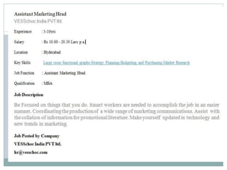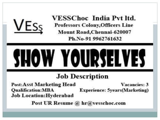 Vesschoc India Pvt Limited is a leading nutrition and wellness company with a need to recruit three Assistant Marketing Heads in Hyderabad to support business expansion. The candidates should possess strong skills in strategy planning, budgeting, and market research, and require an MBA with 5-10 years of experience. The selection process includes resume shortlisting, Skype interviews, psychometric assessments, and personal interviews.