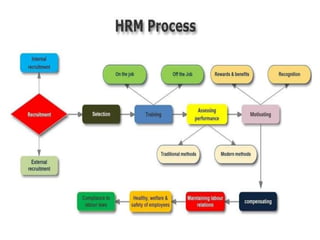 This document discusses human resource management and recruitment. It defines human resource management as planning, organizing, directing, and controlling activities related to procuring, developing, compensating, and integrating employees to satisfy organizational, individual, and societal needs. It outlines the objectives of HRM and components of a human resource management system. It then defines recruitment as the process of attracting job applicants and discusses the objectives, importance, sources, and process of recruitment. The key points covered are internal sources like promotions and referrals versus external sources like advertisements and consultants, and factors that affect recruitment decisions.