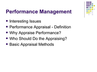 The document discusses performance management and performance appraisals. It defines performance appraisal as evaluating an employee's current or past performance in relation to their performance standards. Reasons for appraising performance include providing input for promotion and salary decisions, allowing bosses and subordinates to develop correction and reinforcement plans, and reviewing career plans. Methods for who conducts appraisals and basic appraisal methods are also outlined.