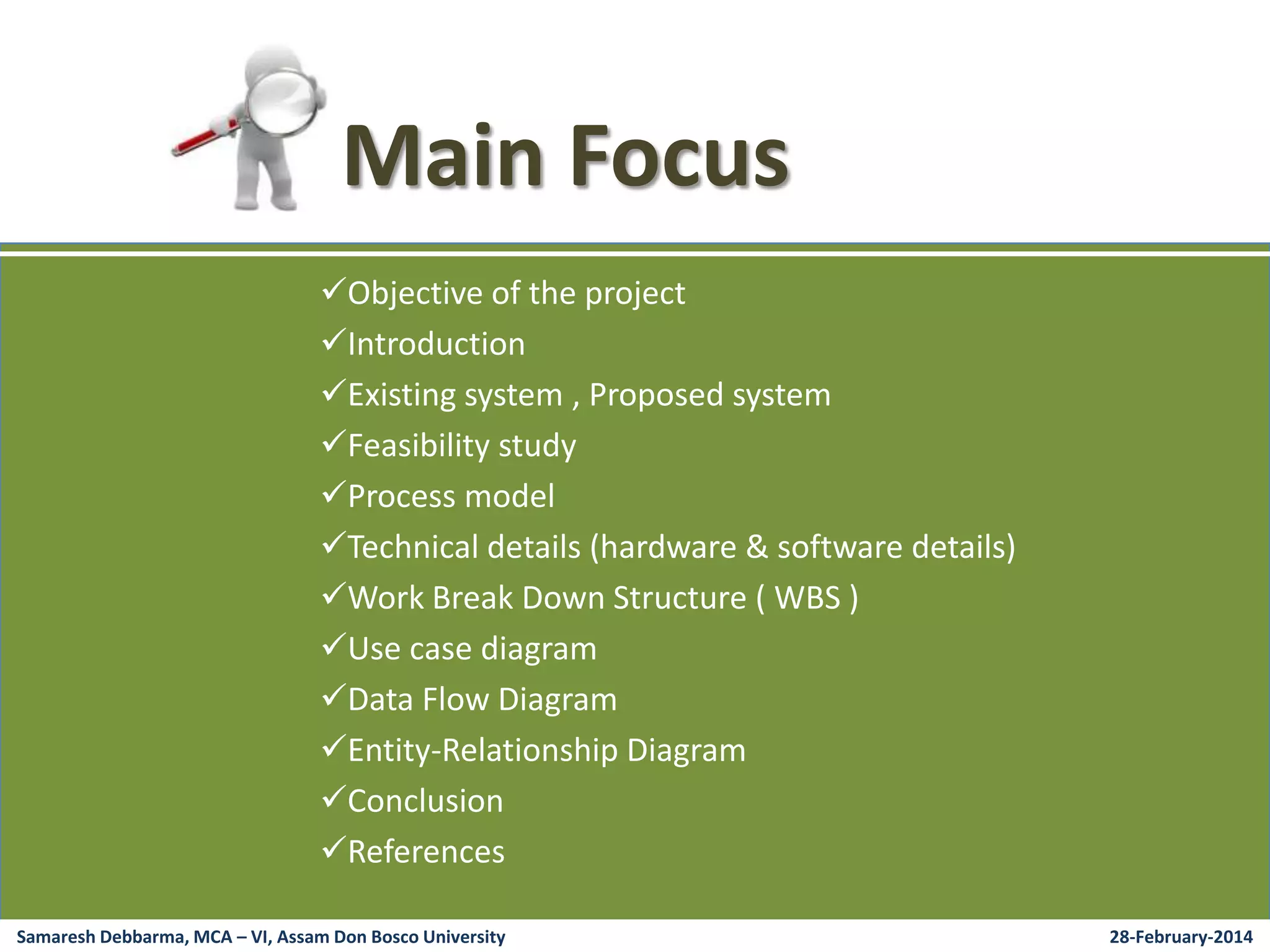 The document outlines a project proposal for developing a web-based Human Resource Management System (HRMS) for Assam Don Bosco University, aimed at integrating HR activities and addressing shortcomings of the current system. Key components of the proposed system include recruitment management, performance management, and enhanced data accuracy, with a focus on operational feasibility and user-friendliness. The document details the planned process model, technical specifications, and expected advantages such as improved efficiency and scalability for future modifications.