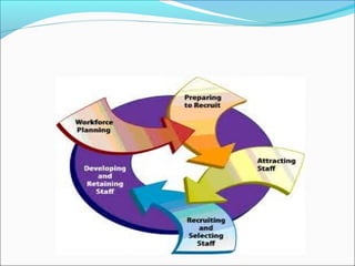 The document discusses human resource planning (HRP), including its objectives, stages, and barriers. HRP involves forecasting an organization's future human resource needs, current supply, identifying gaps, and creating action plans. The key stages are forecasting demand and supply, programming to address gaps, implementation through recruitment and staffing, and ongoing control and evaluation. Barriers to effective HRP include lack of buy-in, financial limitations, and not involving all managers.