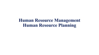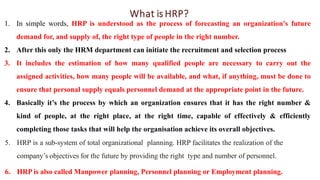 Human Resource Planning (HRP) involves forecasting an organization's future demand for and supply of employees. It ensures the organization will have the right number and types of qualified people in the right places and times to achieve organizational objectives. HRP is a continuous process that is part of corporate planning and involves forecasting personnel needs, analyzing current staffing levels, and developing recruitment, training, and other programs to close any gaps between demand and supply. The goal of HRP is to link human resources with organizational strategy and ensure optimal staffing that benefits both the organization and employees.