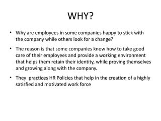 The document discusses the importance of effective HR practices in enhancing employee satisfaction and retention within organizations. It outlines best practices such as 360-degree feedback, creating a safe and healthy workplace, performance incentives, and recognizing top performers, which all contribute to a motivated workforce. Furthermore, it emphasizes the need for open communication, fair evaluations, and a supportive work environment to foster productivity and organizational success.