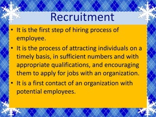 The document discusses recruitment and selection practices. It covers the goals of recruitment as attracting qualified applicants and discouraging unqualified ones. It also discusses constraints, diversity efforts, factors influencing recruitment, and the advantages and disadvantages of internal and external recruitment sources. Finally, it covers socializing and placing new hires, including purposes, processes, and considerations for developing socialization programs.