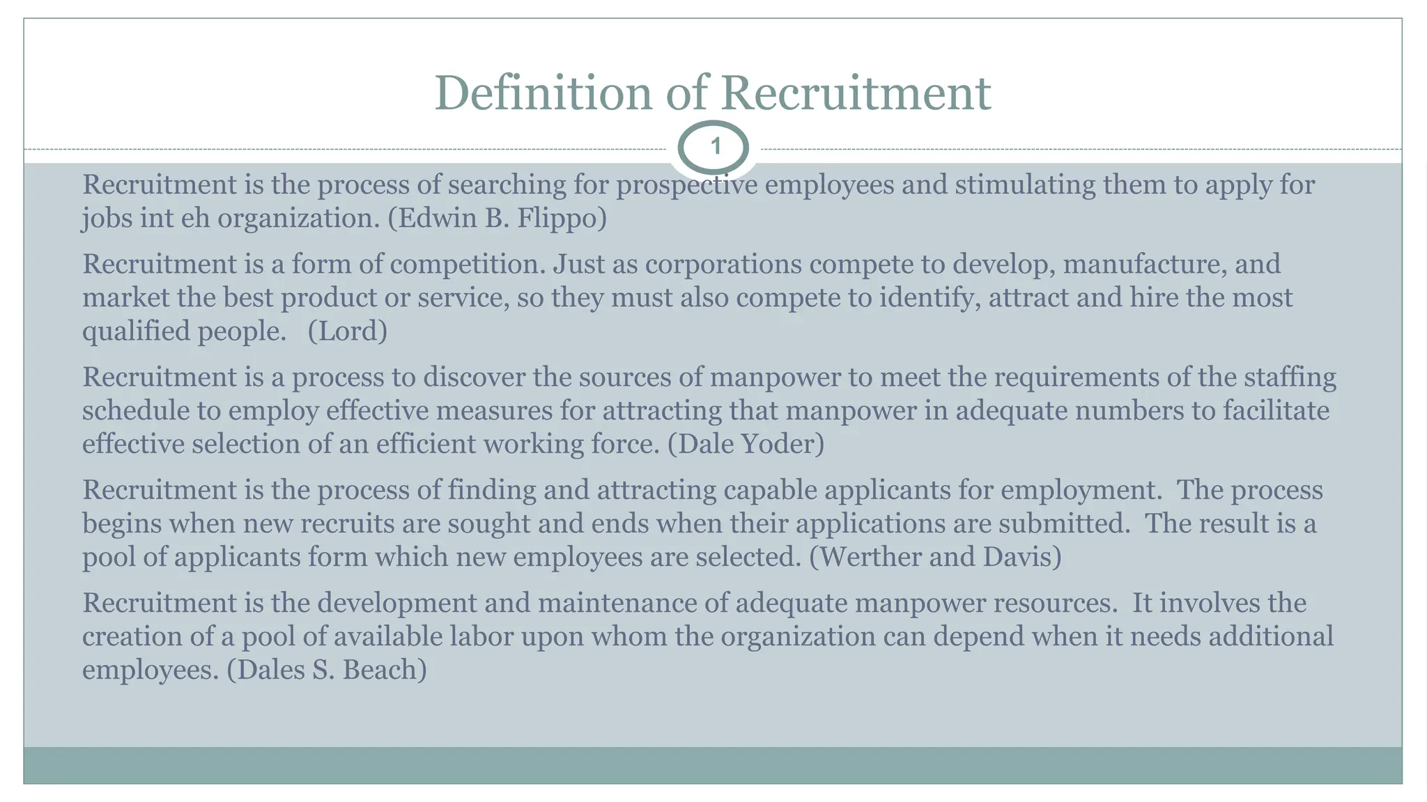 Recruitment is the development and maintenance of adequate manpower resources. It involves the