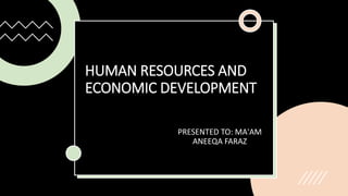 The document discusses the relationship between human resources and economic development, emphasizing the importance of HR in achieving strategic goals and fostering employee growth. It outlines the key components of HR development, the significance of health services, nutrition, and water supply in economic growth, and the impact of social factors like religion and family dynamics on economic development. The conclusion highlights that economic development is a multifaceted process influenced by various economic and non-economic factors.