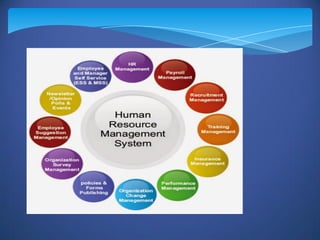 The document discusses the components and benefits of a Human Resource Management System (HRMS). An HRMS is a software system that helps HR staff manage employees more efficiently. It includes modules for application management, employee management, payroll management, performance management, and other HR functions. Using an HRMS can help organizations save time and costs, improve processes, and better manage their workforce.