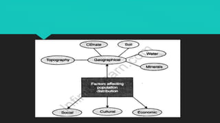 The document discusses human resources as a nation's greatest asset and explores population distribution patterns, highlighting that over 90% of the global population resides on about 30% of the land. It examines factors affecting population density including geography, climate, and social-economic elements, while also noting the significant population changes and various growth rates across countries. Additionally, the document introduces the concept of population composition and how it can be analyzed through population pyramids.