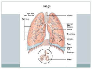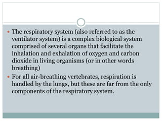 The respiratory system is comprised of several organs involved in breathing, including the nose, mouth, pharynx, larynx, trachea, bronchi, bronchioles and lungs. Air enters through the nose or mouth and passes through these structures made of cartilage, muscle and mucous membranes to warm, moisten and filter the air before it reaches the lungs. In the lungs, the air flows through increasingly smaller airways called bronchioles until reaching tiny air sacs called alveoli where oxygen and carbon dioxide are exchanged.