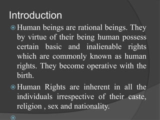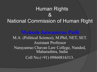 The document discusses human rights and the National Commission of Human Rights in India. It defines human rights as basic rights that individuals possess by virtue of being human. It outlines civil, political, and economic, social, and cultural rights. It then describes the National Commission of Human Rights in India, which consists of 8 members including a chairperson and investigates human rights violations. The commission works to promote and protect human rights in India through research, education, and intervention.