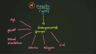 Minorities are numerically inferior groups within a population that possess distinct ethnic, linguistic or religious characteristics. Minority rights protect individuals' and groups' ability to express their culture and identity. International law and charters like the UN Declaration on Minority Rights protect minorities. While Islam historically protected minorities under concepts like dhimmi and protected peoples, minorities in Pakistan face discrimination in laws and under-representation. Reforms are needed to guarantee minorities' fundamental rights and end discrimination.