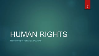 Human rights are inherent to all human beings by virtue of their humanity. They include civil/political rights like the right to life and liberty, as well as economic/social/cultural rights to necessities of life. The UN Universal Declaration of 1948 codified five basic human rights that countries have agreed to uphold: equality, life, freedom from slavery, fair trial, and freedom of expression. Human rights are important because they establish minimum standards to protect human dignity and require countries to respect, protect, and fulfill these rights through domestic laws and international obligations. Upholding human rights is essential because all people deserve them equally by virtue of their shared humanity.