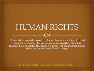 The document discusses human rights and the role of the state in protecting them. It notes that human rights are inherent to all humans from birth and that states have established legal systems to safeguard these rights in order to ensure human survival. It then provides examples of definitions of human rights from various sources and categorizes the different types of human rights. Finally, it outlines some of the efforts taken by the Indonesian government to uphold human rights, including establishing a national human rights commission, ratifying international human rights treaties, and incorporating protections into domestic law.