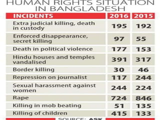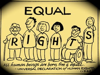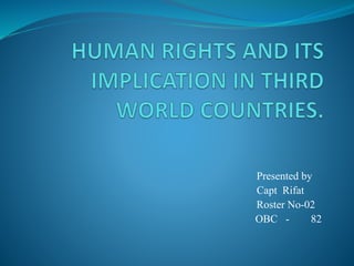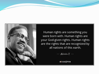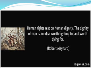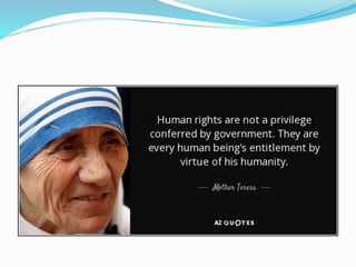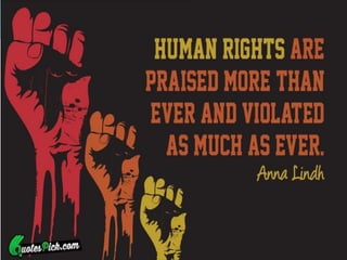 The document discusses human rights and provides examples of violations. It defines human rights as those inherent to human dignity. The Universal Declaration of Human Rights established international standards in 1948. Examples of violations include over 400 children dying from lead poisoning in Nigeria, over 1,000 Rohingya homes burned in Myanmar, and the death of Syrian refugee Aylan Kurdi attempting to reach Canada. The conclusion calls for more effective protection of rights through United Nations organizations and other advocates.