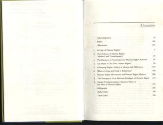 This document appears to be the table of contents and preface for a book titled "The Future of Human Rights" by Upendra Baxi. The preface discusses rewriting histories of human rights and the relationship between statecraft and human rights. It notes that human rights concepts have multiple origins from people in struggle, and that both progressive and regressive Eurocentrism suppress alternate civilizational understandings of human rights. The preface also critiques viewing human rights solely through the lens of statecraft, arguing it fails to acknowledge traditions of resistance and the role of human rights activism in universalizing rights for all peoples.