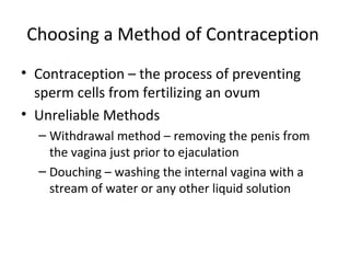 The document discusses various methods of contraception including barrier methods like condoms and diaphragms, hormonal methods like birth control pills and implants, fertility awareness techniques, intrauterine devices (IUDs), and surgical sterilization methods. It provides details on effectiveness, proper use, side effects, and limitations for preventing pregnancy and STIs for each method.