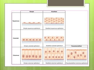 This document provides an overview of the four basic types of tissues in the human body: epithelial, connective, muscular, and nervous tissue. It describes their general characteristics, classifications, and locations. Epithelial tissue covers and lines body surfaces and organs. It is classified based on cell layers and shapes. Connective tissue connects and supports other tissues. Its classifications include connective tissue proper, cartilage, bone, and blood. Muscular tissue is excitable and contractile, with three types: skeletal, smooth, and cardiac. Nervous tissue is the most complex and forms the brain, spinal cord, and nerves to regulate body functions.