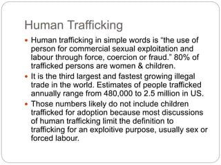 This document discusses issues related to human trafficking in the context of surrogacy and adoption. It notes that human trafficking disproportionately affects women and children and involves exploitation through forced labor or sex work. The document also discusses how adoption and surrogacy regulations do not fully prevent the buying and selling of children. There are risks of exploitation of surrogate mothers through financial and health issues without proper protections or support. Solutions proposed include providing better information to prospective parents about risks, and changing laws to prioritize protecting victims over prosecution in cases of trafficking and prostitution of minors.